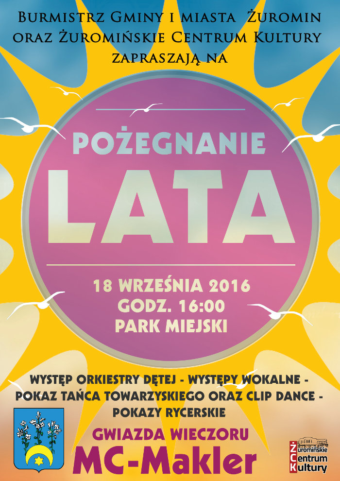 Bo lato trzeba pożegnać. Pożegnanie tegorocznego lata odbędzie się w Żurominie 18 września. Od godziny 16:00 w Parku Miejskim będą odbywać się występy artystyczne, zagra orkiestra dęta. Będzie pokaz tańca towarzyskiego oraz clip dance, a także pokazy rycerskie. Dla wszystkich zagra również zespół MC Makler. Organizatorem jest Żuromińskie Centrum Kultury.